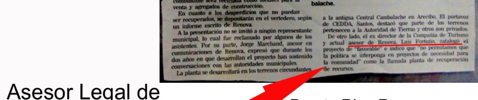El actual gobernador Luis Fortuño era el abogado de Renova, la compañía que en 1999 quería construir un incinerador en Arecibo. Esta compañía cambió su nombre a Energy Answers ahora y trajo la misma propuesta con el apoyo del gobierno PNP. Puede ver prueba de esto en los siguientes artículos de periódico.