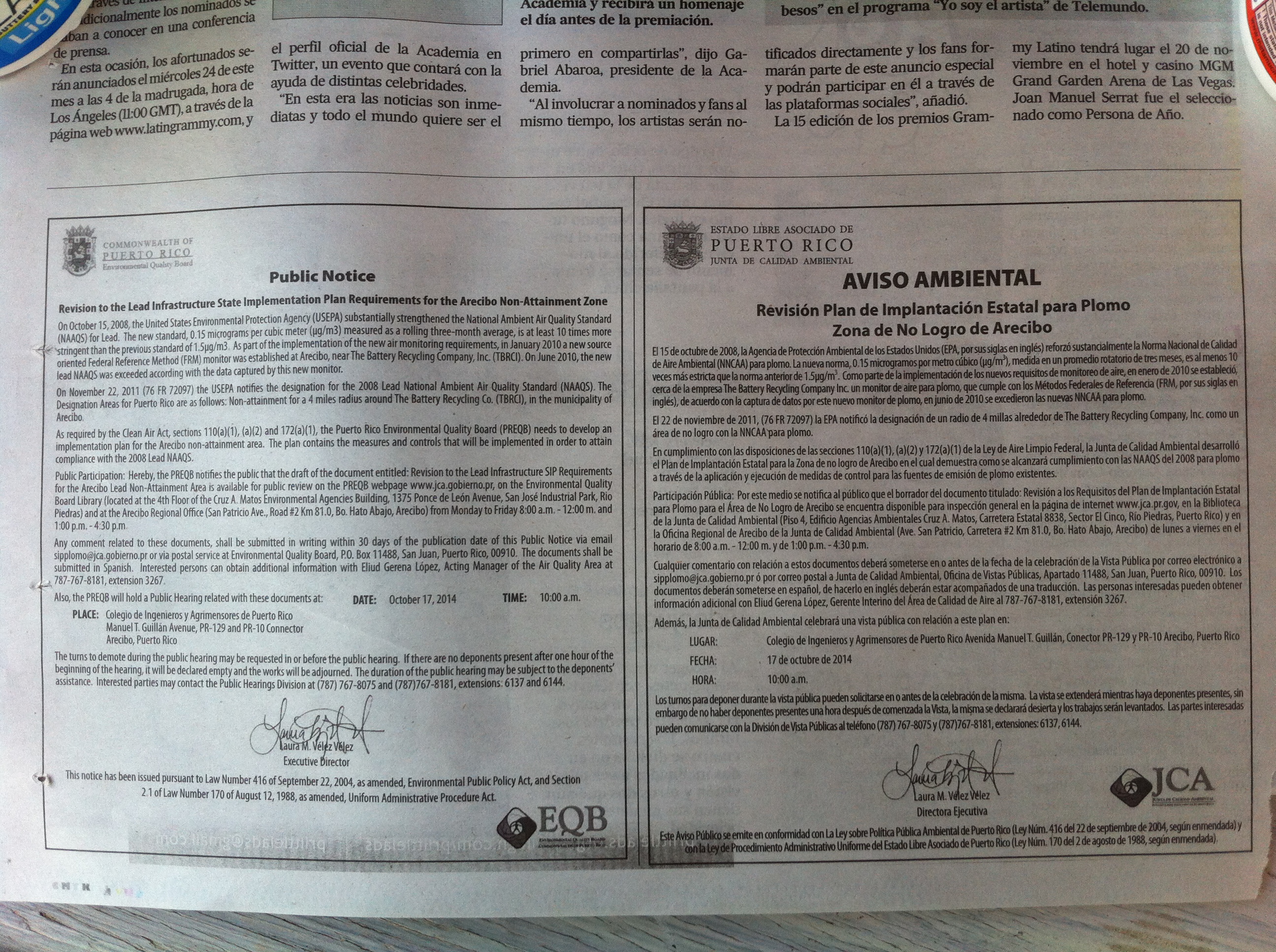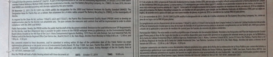 Asiste mañana viernes 17 de octubre a las 10am en el Colegio de Ingenieros de Arecibo a la vista púbica sobre la Revisión al Plan de Implantación Estatal para Plomo para el Área de No Logro de Arecibo. Debemos oponernos a que este nuevo plan incluya la contaminación con plomo de los arecibeños. El plan pretende abrirle la puerta a la chimenea de la incineradora argumentando que no contaminará más. ¡Así que hay que oponernos a eso!