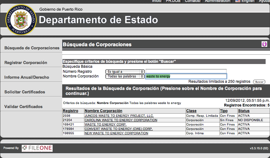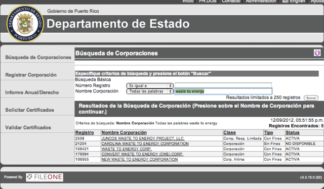 En la página oficial del Departamento de Estado de Puerto Rico aparecen 6 Corporaciones Waste-to-Energy registradas al día de hoy. Estas 6 son las que tienen las palabras Waste-to-Energy en el nombre de la compañía y no representan un número total y finito.